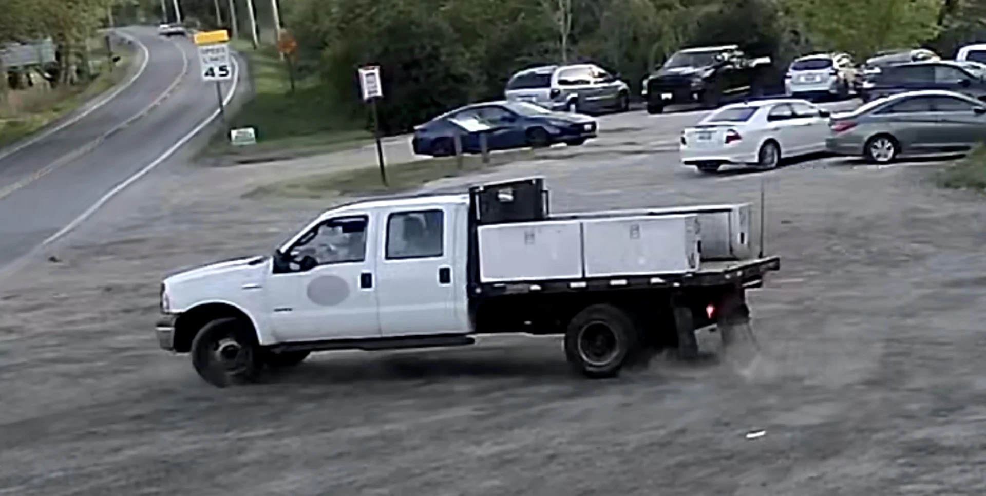 On Tuesday, April 21, at approximately 7:25 p.m., the truck shown in this image was captured on video surveillance intentionally spinning its tires and driving in tight circular patterns in a dirt lot owned by a local business in Chaptico, resulting in property damage.